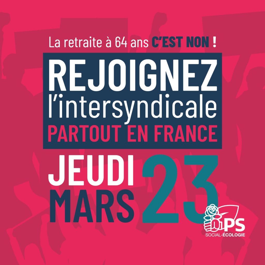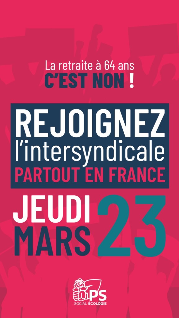 Visuels Retraite à 64 ans c’est Non Publié le 20 mars 2023 par admin-ps Visuels du 23 Mars Partager : Cliquer pour partager sur X(ouvre dans une nouvelle fenêtre) X Cliquez pour partager sur Facebook(ouvre dans une nouvelle fenêtre) Facebook J’aime chargement… Articles similaires